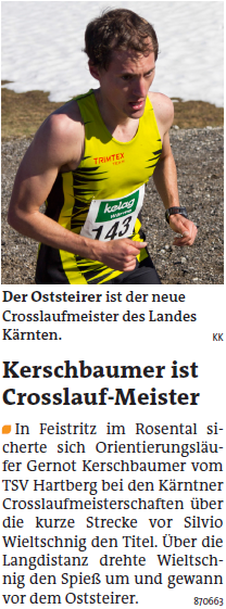 Gernot Kerschbaumer gewinnt die Kurzstrecke über ca. 3,6km in 11:06 des Crosslaufs in Feistritz im Rosental und schlägt damit auch alle Kärnter bei ihren Meisterschaften.