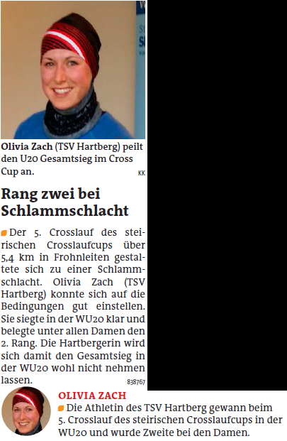 Der 5. Crosslauf des steirischen Crosslaufcups fand am 09.02.2014 in Frohnleiten statt. Olivia Zach belegte unter allen Damen den 2. Rang und siegte in der WU20. Olivia hatte schwierige 5,4 km zu bewältigen. Kälte, Regen, knöcheltiefer Matsch über die gesamte Strecke und noch dazu ein technisch anspruchsvoller Rundkurs, machten diesen Lauf zum Schwierigsten der bisherigen Crossläufe des steirischen Crosslaufcups.