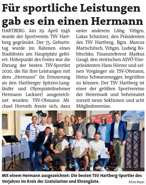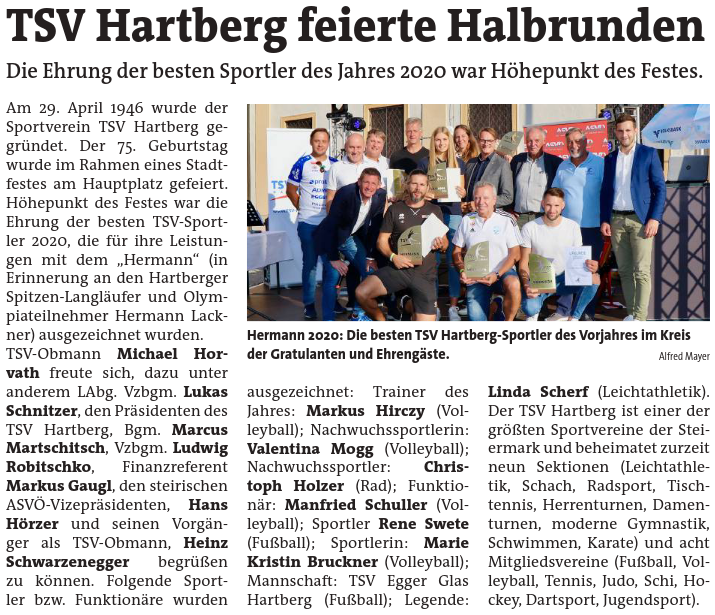Am Freitag dem 3. September fand zum 75-jährigen Jubiläum des TSV Hartberg am Hartberger Hauptplatz ein Stadtfest, organisiert von der TSV Führung und seinen Mitgliedssektionen, statt. Dabei wurden auch die Sportler und Funktionäre des Jahres mit dem Hermann 2020 ausgezeichnet.