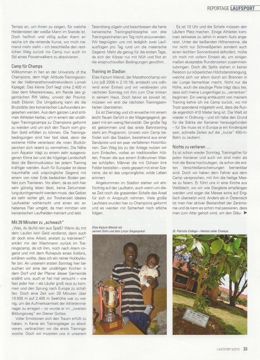 Im aktuellen Laufsport Marathon wurde ein 4-seitiger Bericht unseres Trainingslagers in Kenia (Iten) vom vergangenen Jahr veröffentlicht. Florian Prüller hat unsere Erfahrungen nochmal detailiert für das Magazin zusammengefasst. Wem die Bilder zuwenig sind, der kann hier ein Testabo (2 Ausgaben zum Preis von einer) um 5,50€ bestellen.