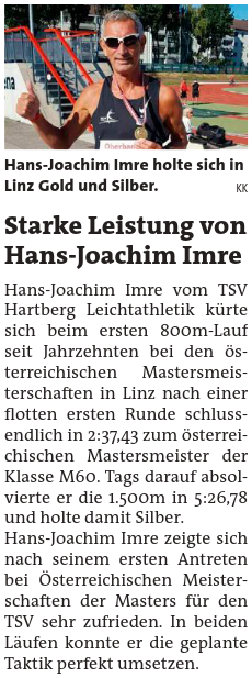 Hans-Joachim Imre rief am Samstag beim ersten 800m Lauf seit Jahrzehnten bei den österreichischen Mastersmeisterschaften in Linz eine tolle Leistung ab und kürte sich nach einer flotten ersten Runde schlussendlich in 2:37,43 zum österreichischen Mastersmeister der Klasse M60. Tags darauf absolvierte Hans die 1500m in 5:26,78 und holte damit Silber.