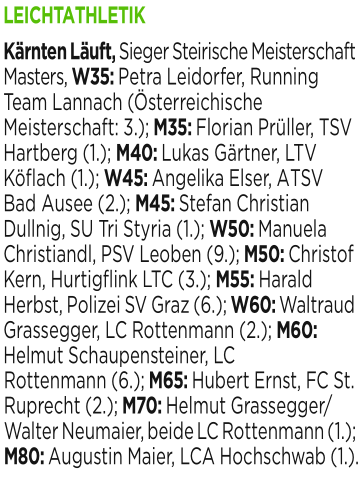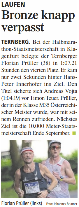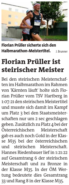 Florian Prüller holte sich den Titel bei den steirischen Meisterschaften im Halbmarathon im Rahmen von Kärnten läuft in 1:07:21 und musste sich damit nur um 2s im Kampf um Platz 3 gegen Hans Peter Innerhofer bei den Staatsmeisterschaften geschlagen geben, obwohl der Salzburger zwischenzeitlich bereits kurz abgerissen war. Zusätzlich zu Platz 4 bei der ÖM und dem Landesmeistertitel gab es auch noch Gold in der Klasse M35 bei der österreichischen und steirischen Meisterschaft.