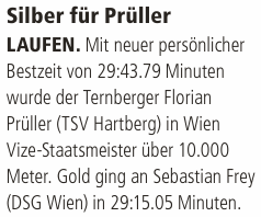 Florian Prüller war am Samstag bei den 10.000m Staatsmeisterschaften im Wiener Leichtathletikzentrum am Start. Nach Bronze im Vorjahr verbesserte sich Florian in diesem Jahr auf Silber hinter Sebastian Frey (DSG Wien) der in 29:15,05 einen österreichischen U23-Rekord aufstellte. Frey lief von Beginn an ein hohes Tempo mit ca. 14:38 Durchgangszeit bei 5km dem nur Florian von Beginn an folgte. Auf der zweiten Streckenhälfte musste er den 19 Jahre jüngeren Wiener schlussendlich etwas ziehen lassen.