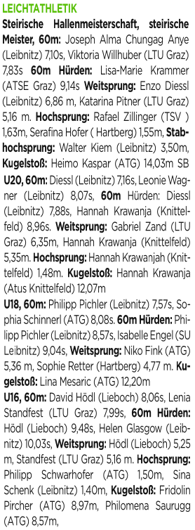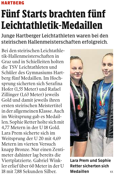Für Serafina Hofer und Rafael Zillinger bedeutete dies jeweils den ersten steirischen Leichtathletik-Meistertitel in der Allgemeinen Klasse, obwohl beide Schüler des Gymnasiums Hartberg noch der U20-Klasse angehören.