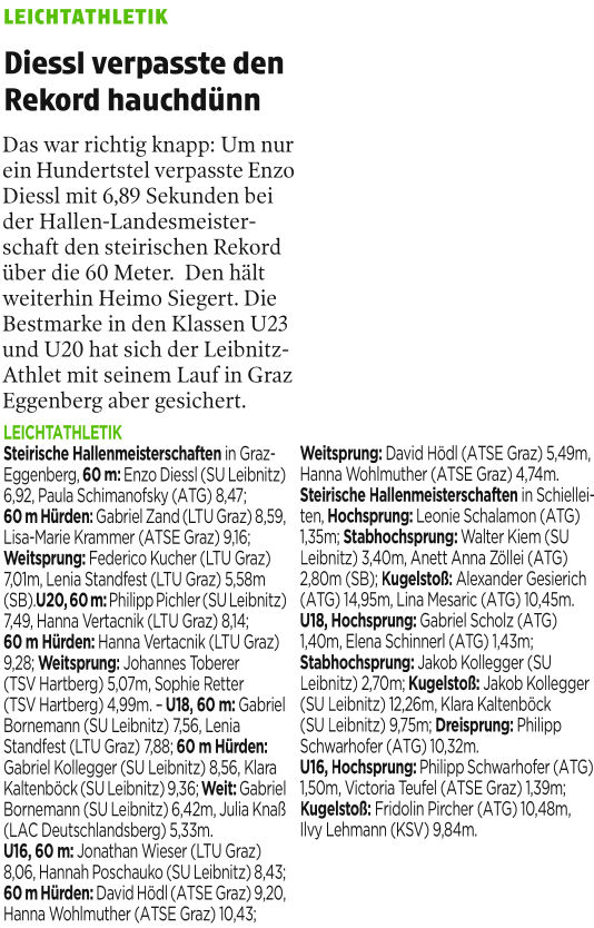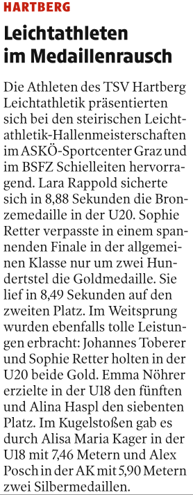 Am Sonntag nahmen mit Alex Posch und Alisa Kager zwei weitere Schüler des Gymnasiums Hartberg für den TSV Hartberg bei den steirischen Meisterschaften im Kugelstoß im BSFZ Schielleiten teil.