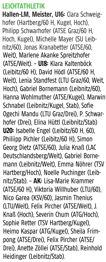 Sophie Retter sicherte sich ihren ersten steirischen Meistertitel in der allgemeinen Klasse im Kugelstoßen mit der 4kg Kugel mit 7,37m (PB). Selbiges gelang Clara Schweighofer in der WU16 mit 9,13m (PB) mit der 3kg schweren Kugel im letzten Versuch. Auch im Hochsprung gelang Clara Schweighofer mit 1,35m (PB) im ersten Versuch der Titel in der Klasse WU16. Die beiden stärksten Konkurrentinnen übersprangen ebenso 1,35m, allerdings erst im dritten Versuch. Und auch der dritten TSV-Starterin Emma Nöhrer gelang im Hochsprung der WU20 der Titel mit 1,40m. Zusätzlich gab es für Clara Schweighofer auch noch Platz 4 im Weitsprung der WU16 mit 4,72m.