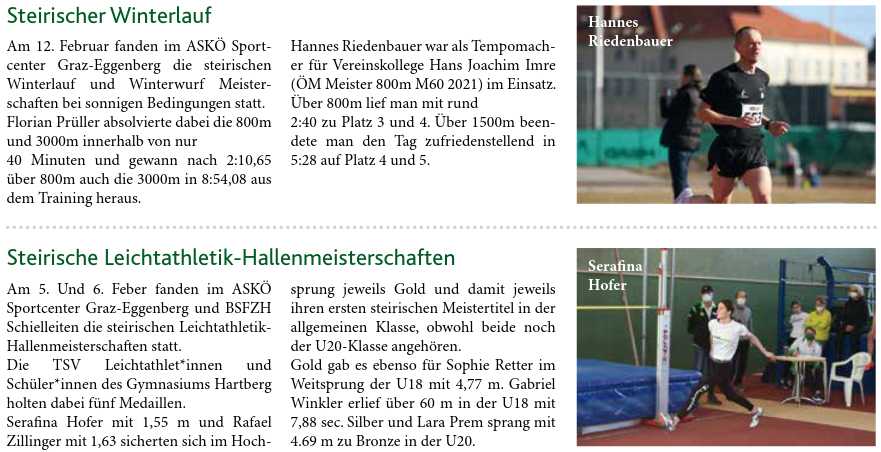 Bei den steirischen Hallenmeisterschaften im Sprint und Weitsprung im ASKÖ Sportcenter Graz-Eggenberg waren mit Lara Prem, Sophie Retter und Gabriel Winkler auch drei TSV-Leichtathlet:innen und Schüler des Gymnasiums Hartberg betreut von Sarah Retter am Start.