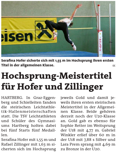 Bei den steirischen Hallenmeisterschaften im Sprint und Weitsprung im ASKÖ Sportcenter Graz-Eggenberg waren mit Lara Prem, Sophie Retter und Gabriel Winkler auch drei TSV-Leichtathlet:innen und Schüler des Gymnasiums Hartberg betreut von Sarah Retter am Start.