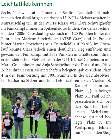 Sechs Nachwuchsathlet:innen der Sektion Leichtathletik nahmen an den diesjährigen steirischen U12/U14 Meisterschaften in Mürzzuschlag teil. Die äußeren Bedingungen im Knappenhof-Stadion waren für Mitte Mai noch eher auf der kühlen Seite, der guten Stimmung und der Leistungen unter den Schützlingen von Trainerin Anna Schützenhöfer tat das aber keinen Abbruch.