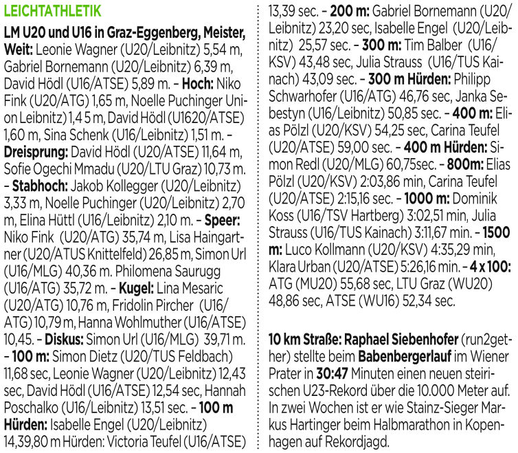 Am Sonntag gelang dann über 1000m in 3:02,51 sogar der erste steirische Meistertitel und ebenso das Limit für die U16-ÖM (3:05) welche nächstes Wochenende in Kapfenberg stattfindet.