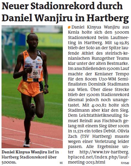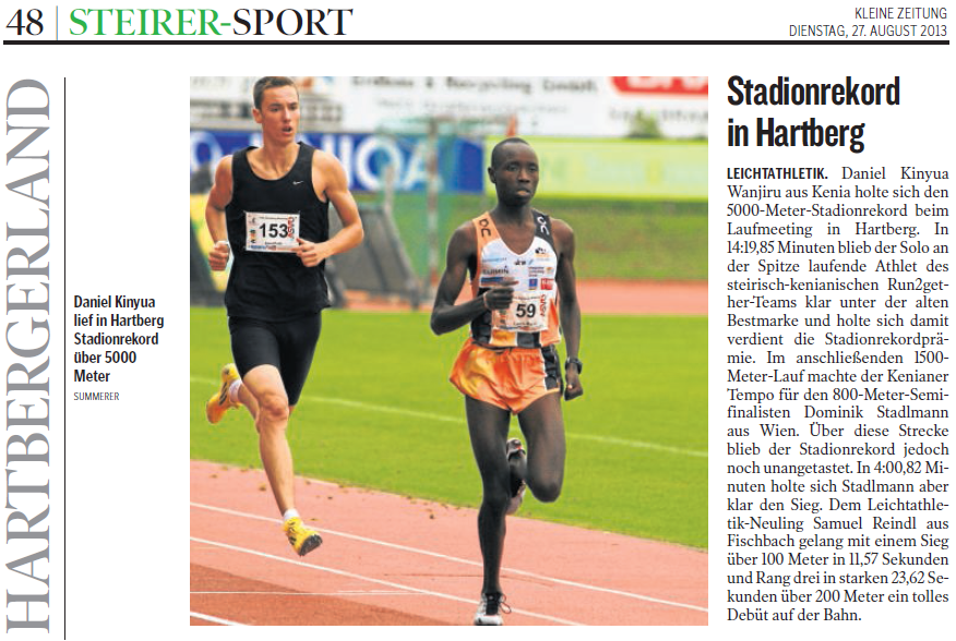 Daniel Kinyua Wanjiru (run2gether) lief von Beginn an ein einsames Rennen an der Spitze über 5000m und gewann mit 14:19,85. Später war Daniel dann dankenswerter Weise auch bereit über 1500m als Tempomacher zu fungieren.