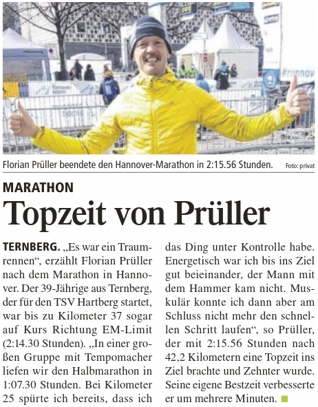 Beim HAJ Hannover Marathon wo in diesem Jahr die deutschen Marathonmeisterschaften ausgetragen wurde erhoffte sich Florian Prüller im Vorfeld ein gutes Feld um sein Ziel unter 2:20 zu laufen in die Tat umzusetzen. Schlussendlich lief es noch viel besser als erhofft, so passierte der 38-Jährige, Vollzeit-Berufstätige, die Halbmarathonmarke in 1:07:31 und lag bei 35km sogar knapp unter dem EM-Limit (2:14:30) für München 2022. Auf den letzten Kilometern büßte Florian dann noch etwas Zeit ein lief aber mit 2:15:56 auf Rang 10 im internationalen Feld und steirischen Landesrekord in der M35 Klasse, sowie die zweitschnellste Zeit eines Läufer im steirischen Dress überhaupt und die schnellste steirische Zeit seit über 30 Jahren! In der ewigen österreichischen Bestenliste bedeutet diese Zeit aktuell Rang 12!