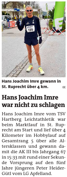 Hans Joachim Imre war am Samstag beim Marktlauf in St. Ruprecht am Start und lief über 4km im Hobbylauf auf Gesamtrang 5 über alle Altersklassen und gewann damit die AK III bis Jahrgang 67 in 15:33 ca. 1s vor dem 5 Jahre jüngeren Peter Heider-Gütl von LG Apfelland.