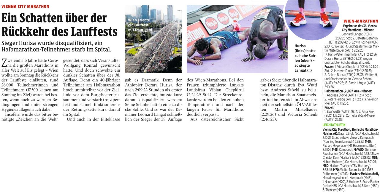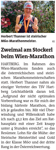 Wie Du bereits weißt habe ich mich als einziger Vertreter des TSV Hartberg Leichtathletik beim Wien Marathon ins Ziel gekämpft. Es war für mich aufgrund der Umstände einer nicht optimalen Vorbereitung ohne längere Trainingsläufe vorher, der hohen Temperaturen und Muskelkrämpfen ab ca. KM 25 der bislang härteste Marathon meiner Laufbahn. Es war viel Überwindung und Willenskraft notwendig, um unter genannten Umständen das Ziel zu erreichen. Der Aufwand hat sich mit 2 Medaillen (Anm.: Steirischer Meister M60 + ÖM Bronze M60) gelohnt, die bei mir einen sehr hohen Stellenwert haben. Ich bin natürlich sehr stolz darüber. Danke nochmals für die Unterstützung! Ich werde mich jetzt erholen und eventuell als letzten Wettkampf heuer den LG Apfelland Genuss Lauf kommenden Samstag bestreiten.