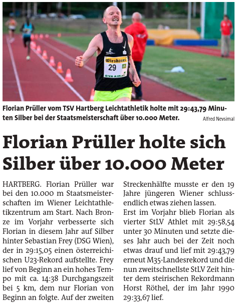 Florian Prüller war am Samstag bei den 10.000m Staatsmeisterschaften im Wiener Leichtathletikzentrum am Start. Nach Bronze im Vorjahr verbesserte sich Florian in diesem Jahr auf Silber hinter Sebastian Frey (DSG Wien) der in 29:15,05 einen österreichischen U23-Rekord aufstellte. Frey lief von Beginn an ein hohes Tempo mit ca. 14:38 Durchgangszeit bei 5km dem nur Florian von Beginn an folgte. Auf der zweiten Streckenhälfte musste er den 19 Jahre jüngeren Wiener schlussendlich etwas ziehen lassen.
