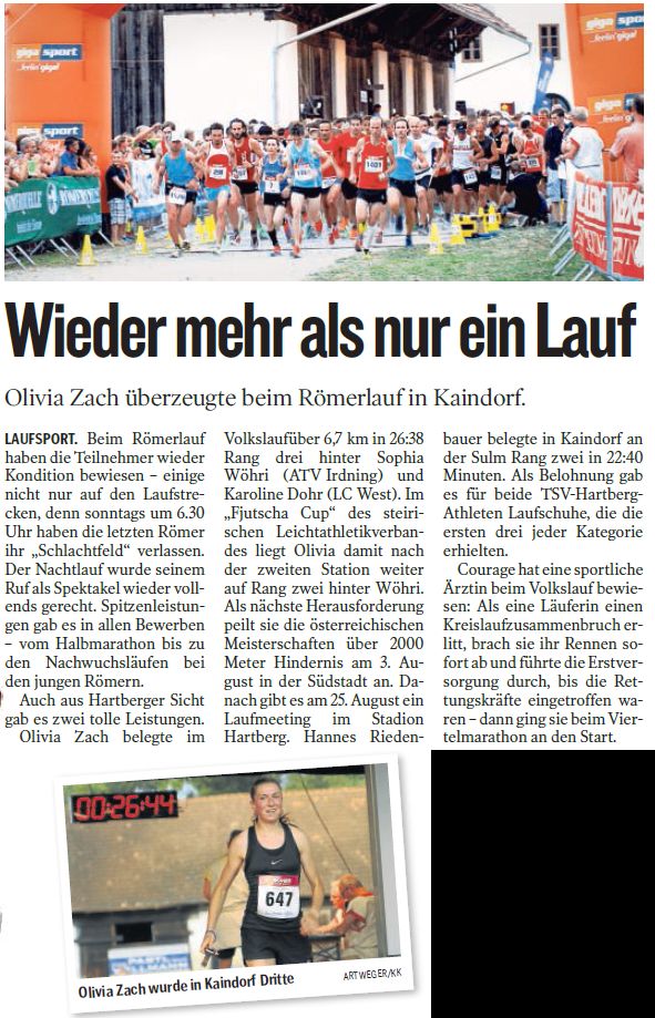 Bei der zweiten Station des STLV Fjutscha Cup's, dem Römerlauf in Kaindorf/Leibnitz, konnte sich Olivia Zach abermals im Spitzenfeld behaupten. Mit Rang 3 unter allen Frauen im Volkslauf bewältigte Olivia den ca. 6,7km langen Volkslauf in 26:38. Im Fjutscha Cup liegt Olivia damit weiter auf Rang 2 hinter Sophia Wöhri vom ATV Irdning.