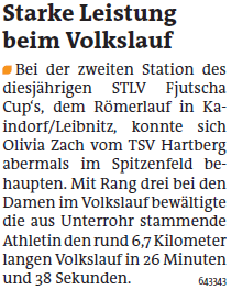 Bei der zweiten Station des STLV Fjutscha Cup's, dem Römerlauf in Kaindorf/Leibnitz, konnte sich Olivia Zach abermals im Spitzenfeld behaupten. Mit Rang 3 unter allen Frauen im Volkslauf bewältigte Olivia den ca. 6,7km langen Volkslauf in 26:38. Im Fjutscha Cup liegt Olivia damit weiter auf Rang 2 hinter Sophia Wöhri vom ATV Irdning.