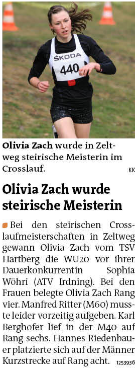 Bei den steirischen Crosslaufmeisterschaften in Zeltweg, die auf einer Langlaufloipe ausgetragen wurden lief Olivia Zach ein starkes Rennen und gewann die WU20 vor ihrer Dauerkonkurrentin Sophia Wöhri (ATV Irdning). Auch in der Gesamtwertung der Frauen fehlten mit Rang 4 nur 11s auf Bronze.