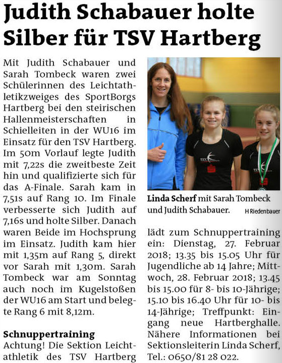 Mit Judith Schabauer und Sarah Tombeck waren zwei Schülerinnen des Leichtathletikzweiges des SportBorgs Hartberg bei den steirischen Hallenmeisterschaften in Schielleiten in der WU16 im Einsatz für den TSV.