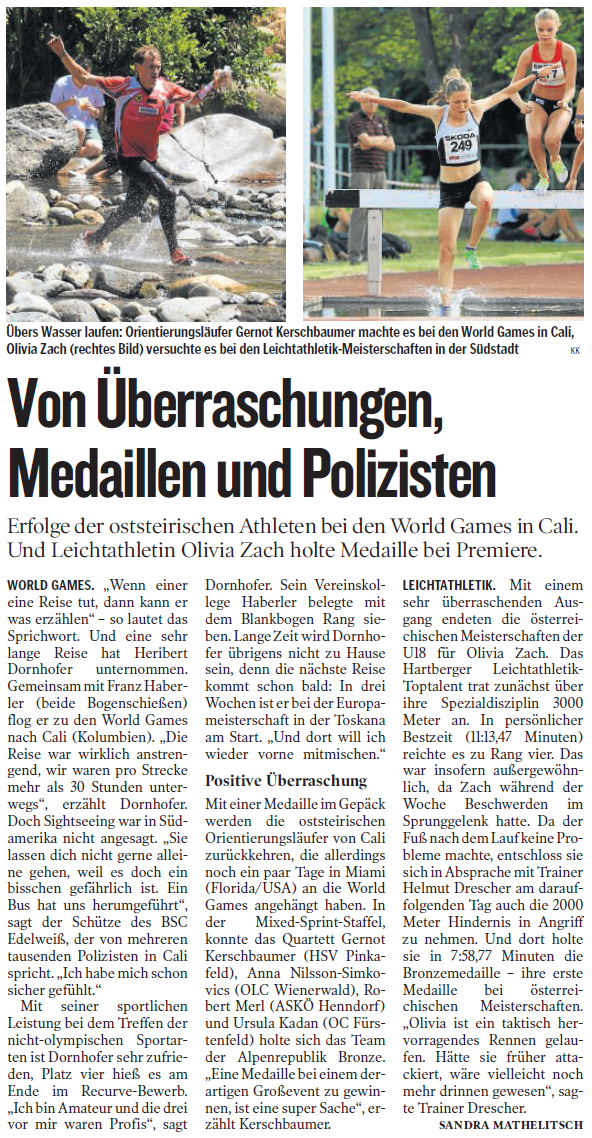 Olivia Zach lief am Samstag nach kleinen Beschwerden im Sprunggelenk in der letzten Trainingswoche auf Platz 4 über 3000m mit neuer persönlicher Bestzeit von 11:13,47. Da nach dem Lauf der Fuß keine Probleme machte, beschloss Olivia mit Trainer Helmut Drescher auch einen Start über die 2000m Hindernis am Sonntag zu wagen. Dort holte Olivia bei ihrem ersten Hindernisrennen überhaupt mit 7:58,77 mit Bronze ihre erste Medaille bei österreichischen Meisterschaften.